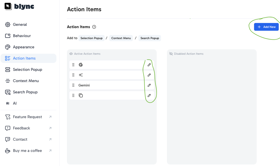 - Select “Edit” on the item you want to modify or click “Add New” to create a new action.