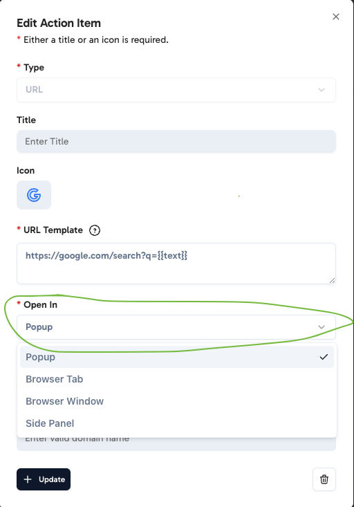 - Popup: Opens the link in a popup within the same tab.
